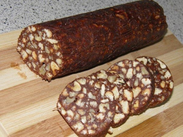 Покрошить печенье и поджаренные орехи. (Есть рецепты сладкой колбаски без орехов. И они имеют право на существование. Но с орехами - это ж совсем другое дело!)