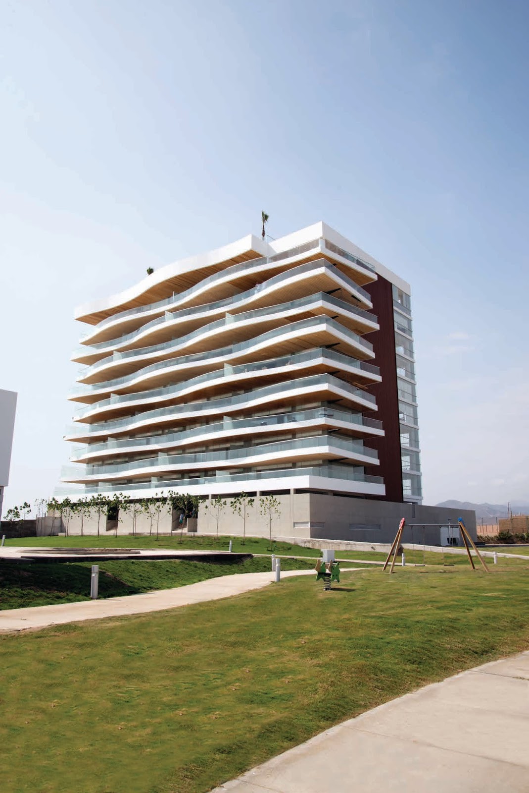 El edificio está compuesto por 10 pisos con departamentos de 3, 4 o 5 dormitorios con baños completos, walking closets, sala comedor, amplia terraza con altas vistas, excelente iluminación natural, ascensor privado de acceso directo y 2 estacionamientos paralelos para cada departamento dentro del edificio. El edificio cuenta con una zona común de recreación en la terraza implementada con poltronas y mesas para eventos o reuniones, además de nuestra piscina panorámica SkyPool.
